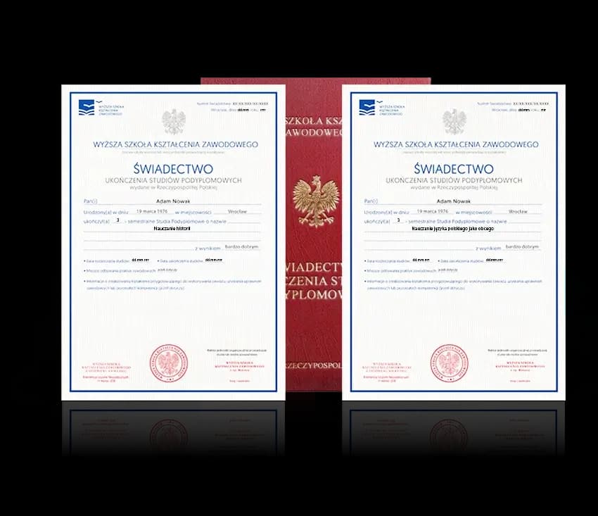 Studia Nauczanie historii i Nauczanie języka polskiego umożliwiają kształcenie w dwóch zakresach jednocześnie. Po ukończeniu kształcenia absolwent uzyskuje dwa odrębne świadectwa:Świadectwo potwierdzające ukończenie studiów podyplomowych Nauczanie historii